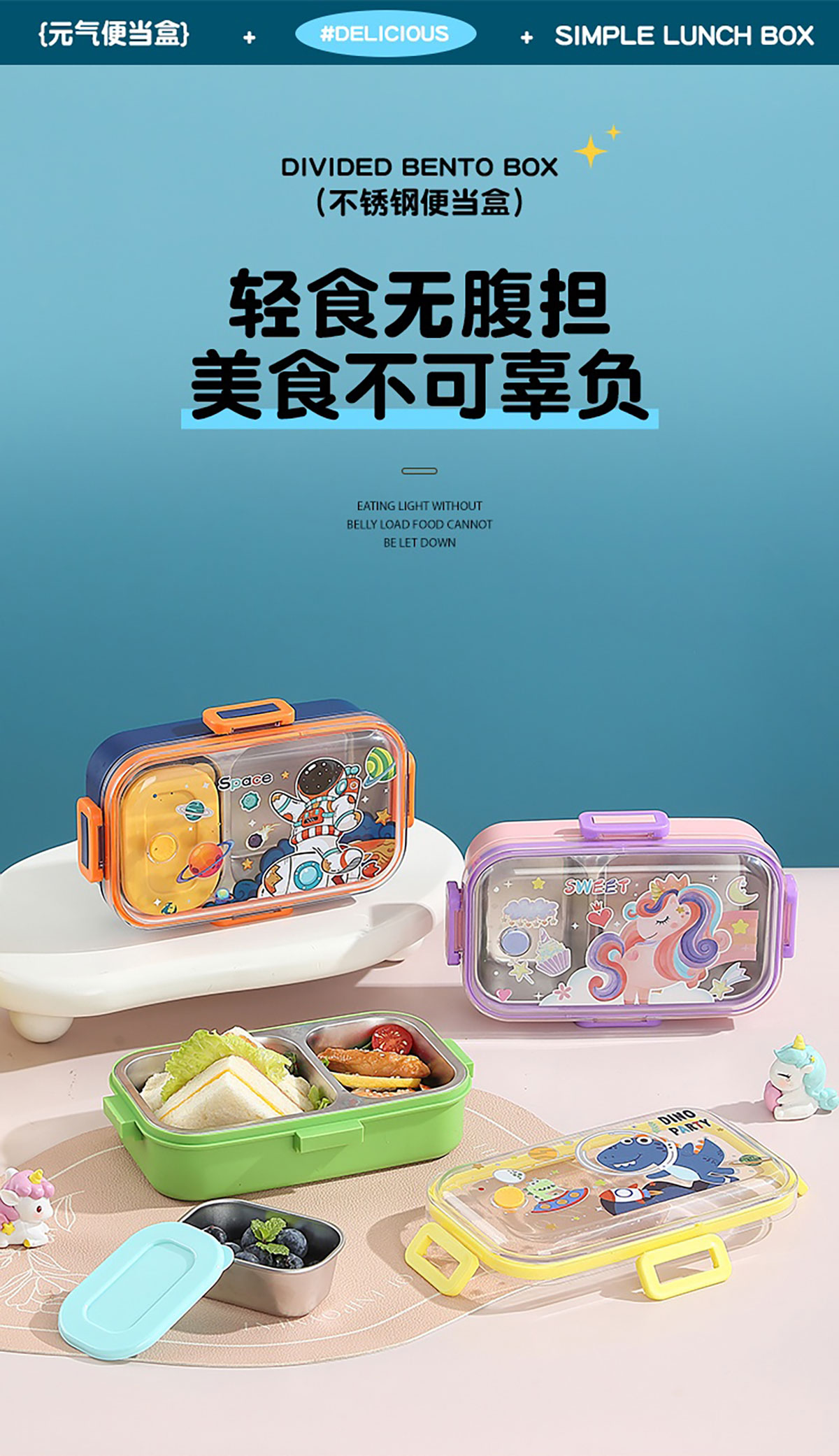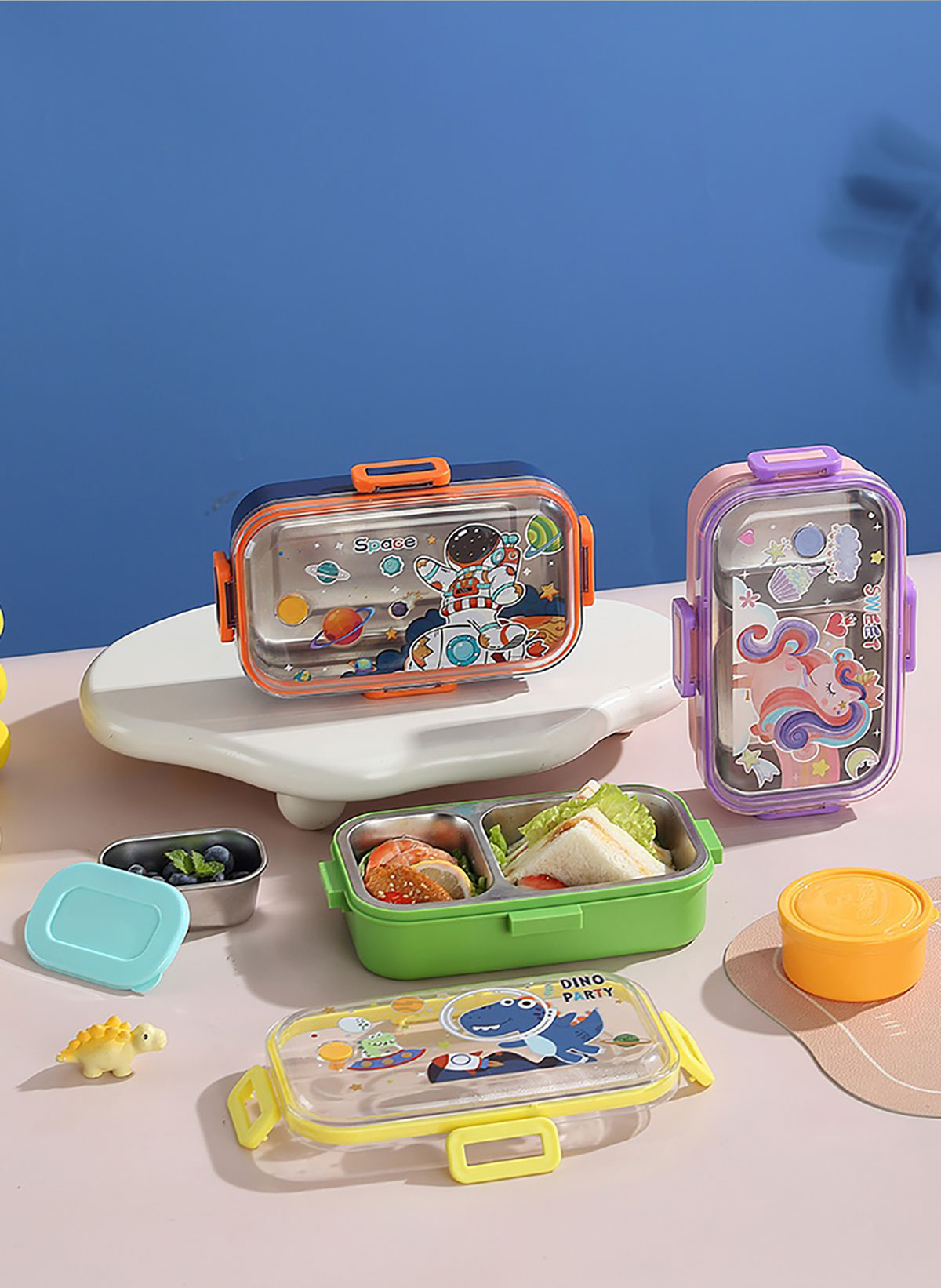 700ml童趣密封不銹鋼餐盒(單格+PP碗150ml/2格+沙拉碗80ml/2格+不銹鋼碗100ml)