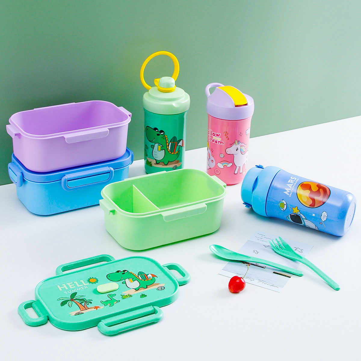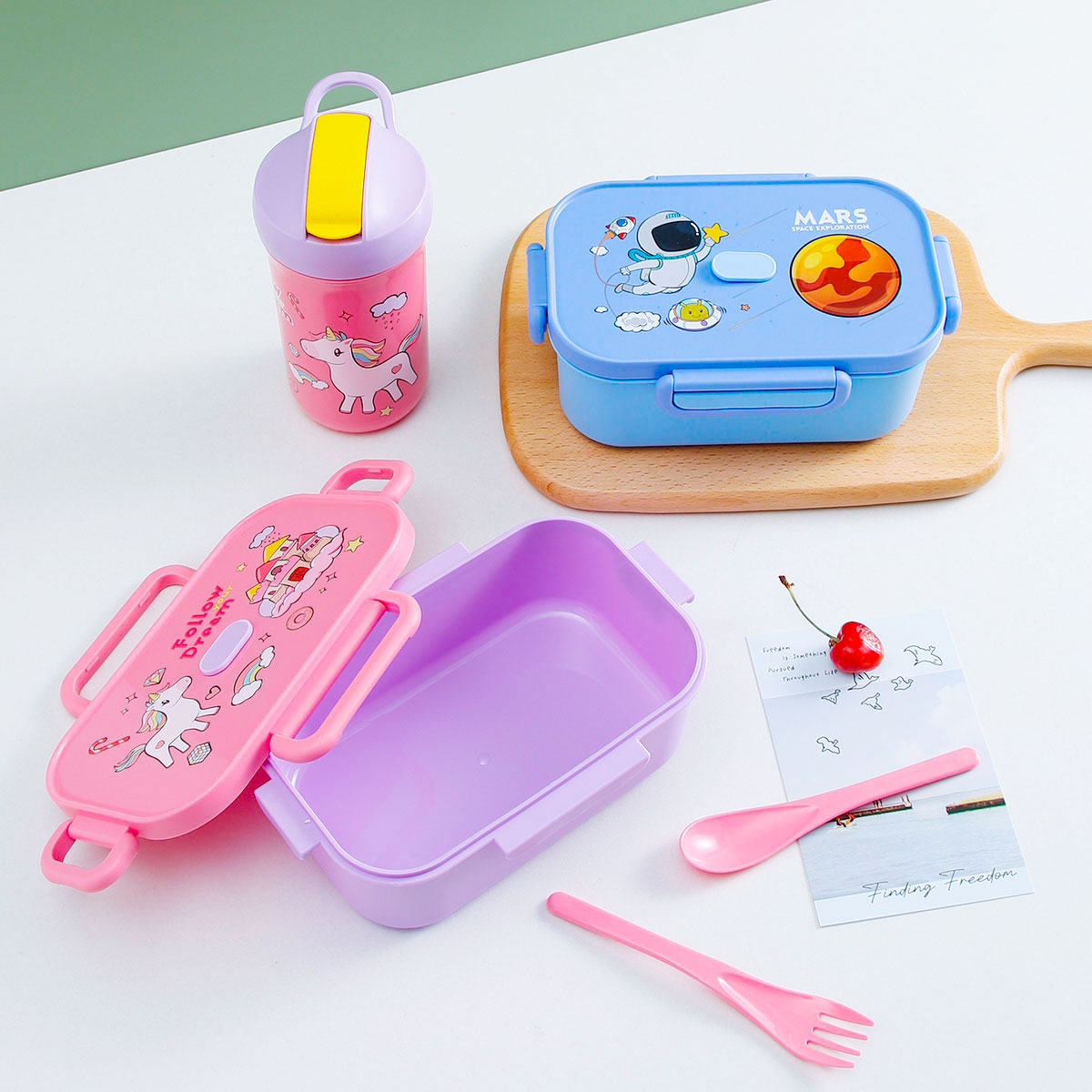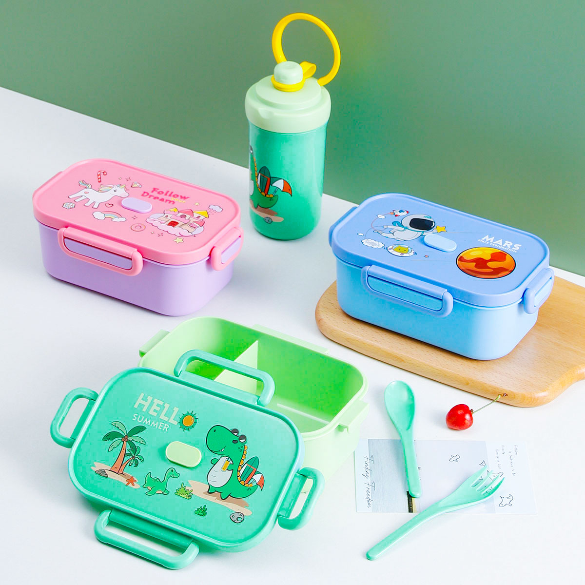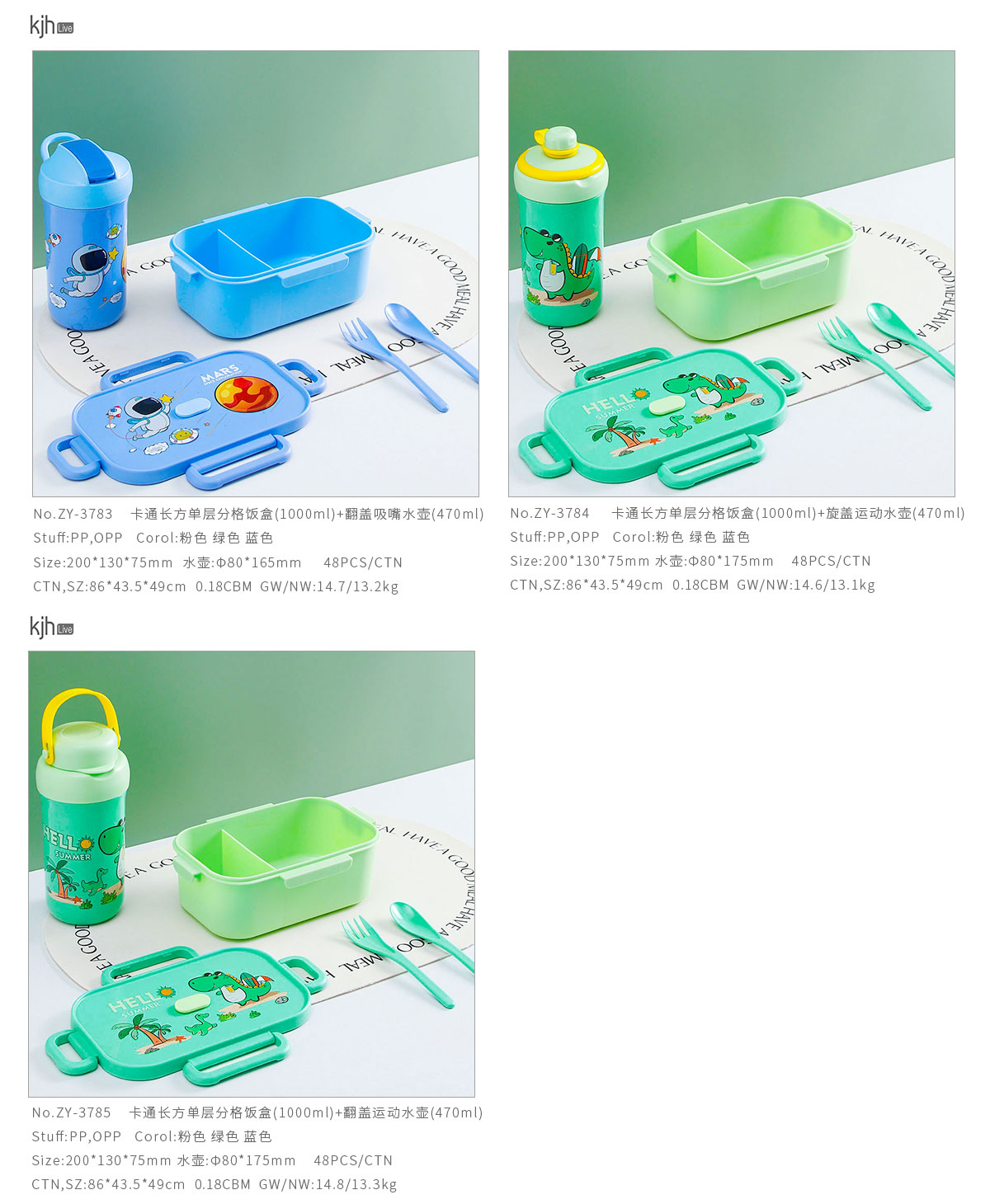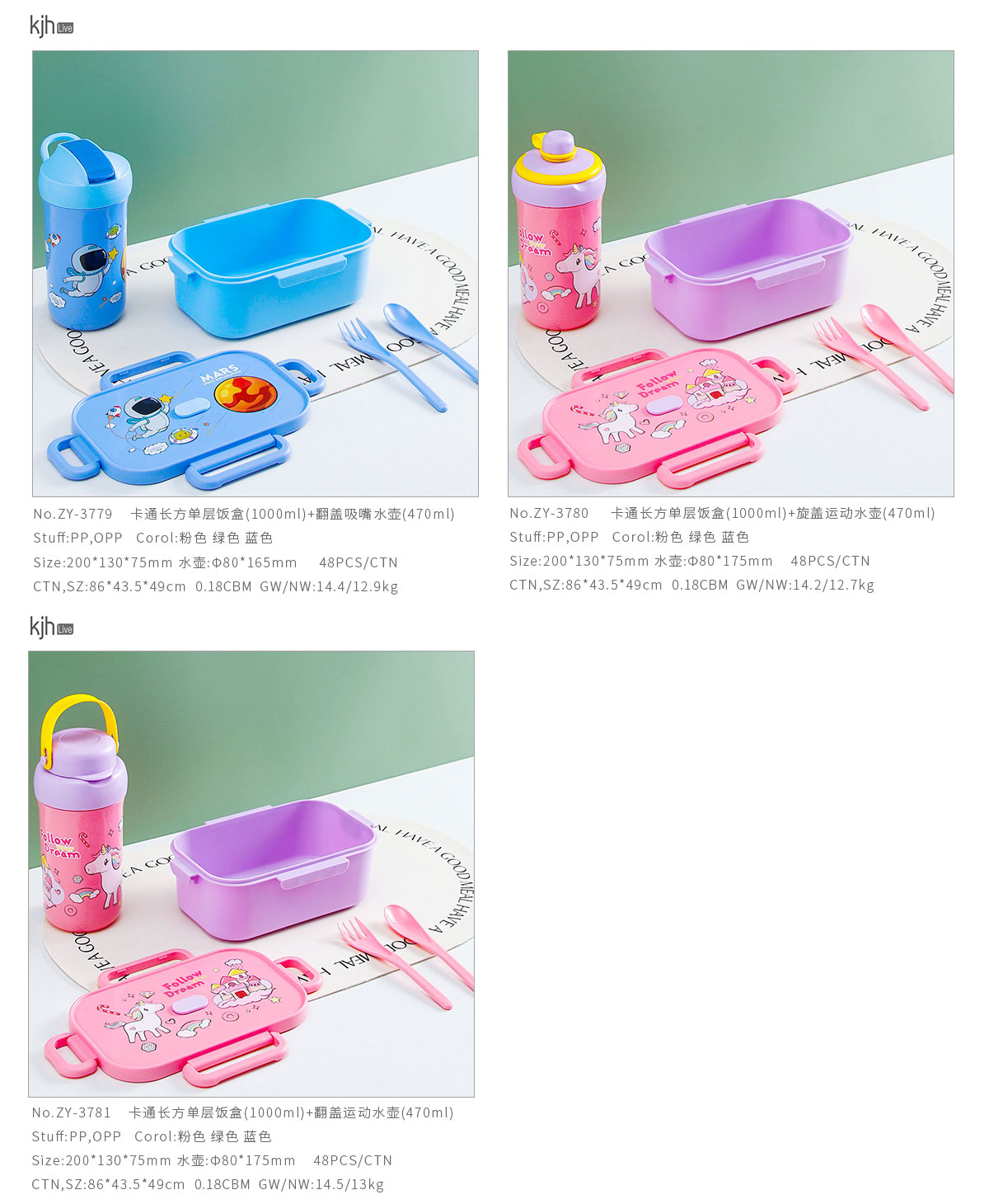 卡通長方單層/單層分格飯盒+翻蓋吸嘴/旋蓋運動/翻蓋運動水壺