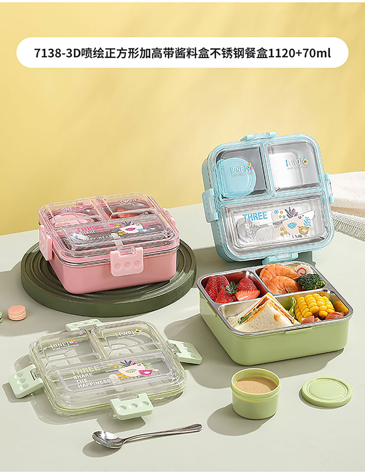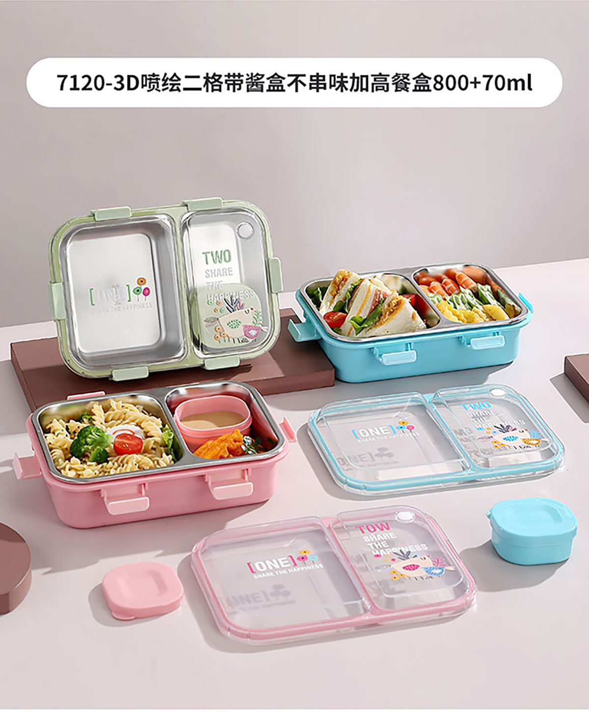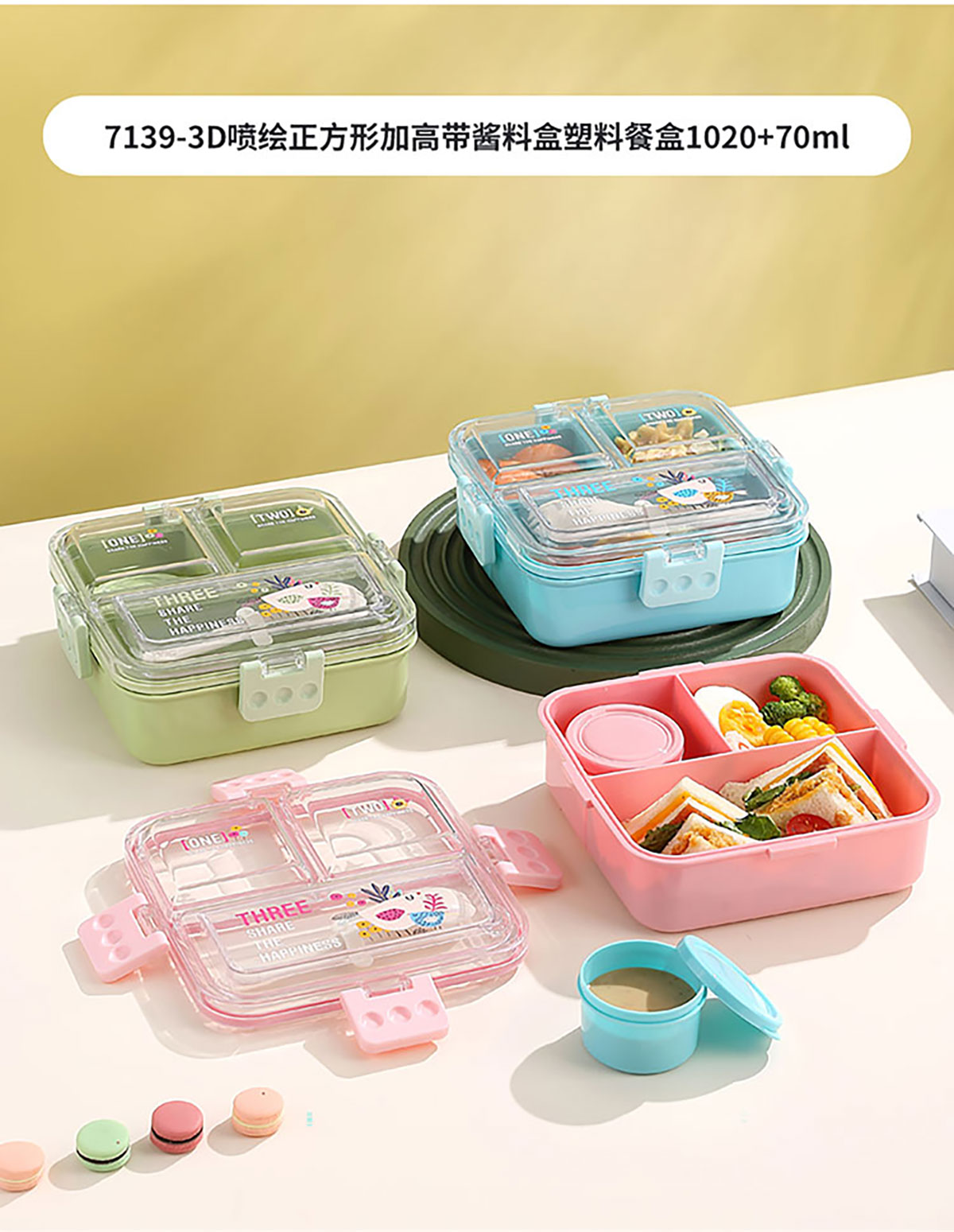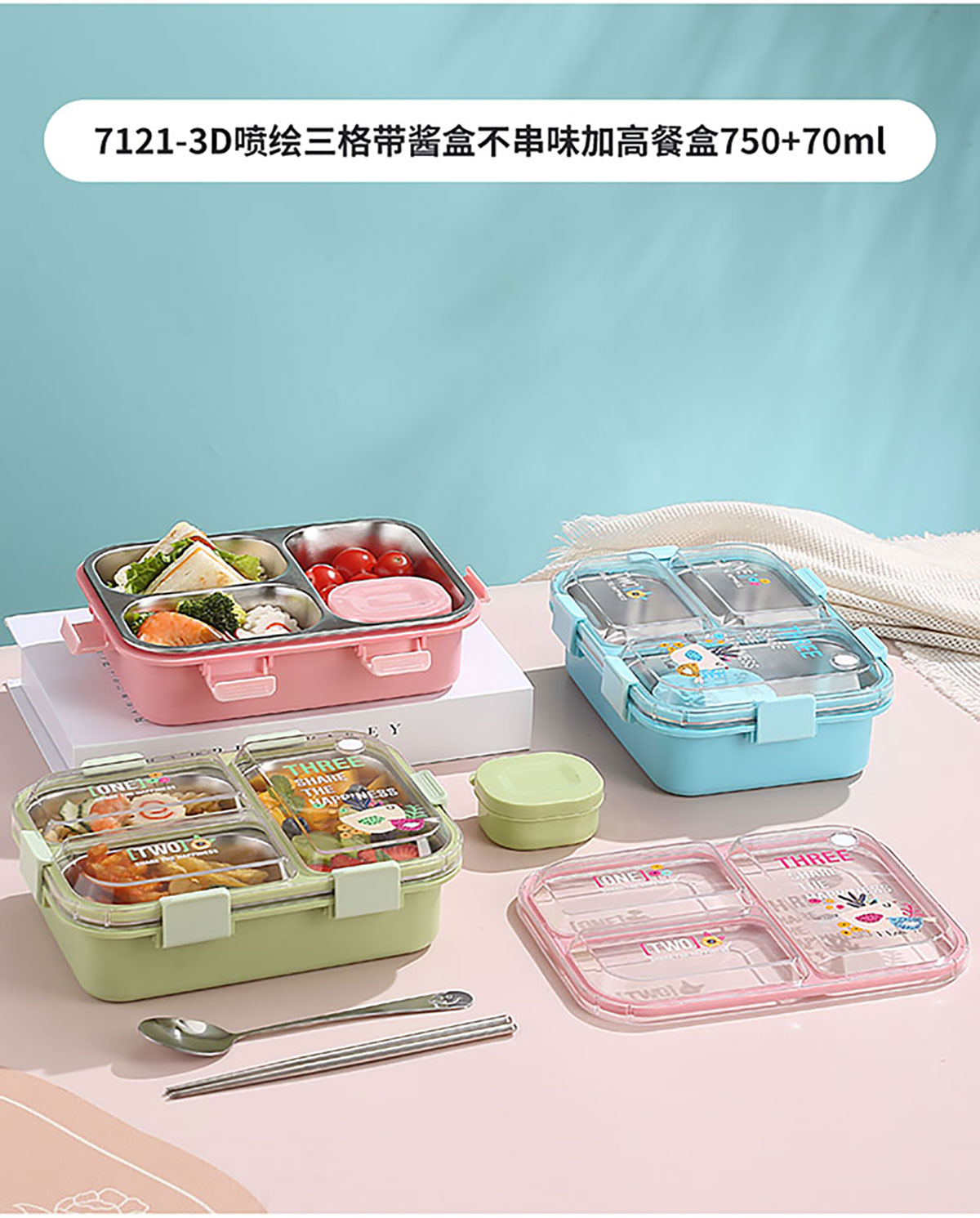 3D噴繪二格/三格帶醬盒/三格帶碗不串味加高餐盒 長(zhǎng)方形/正方形