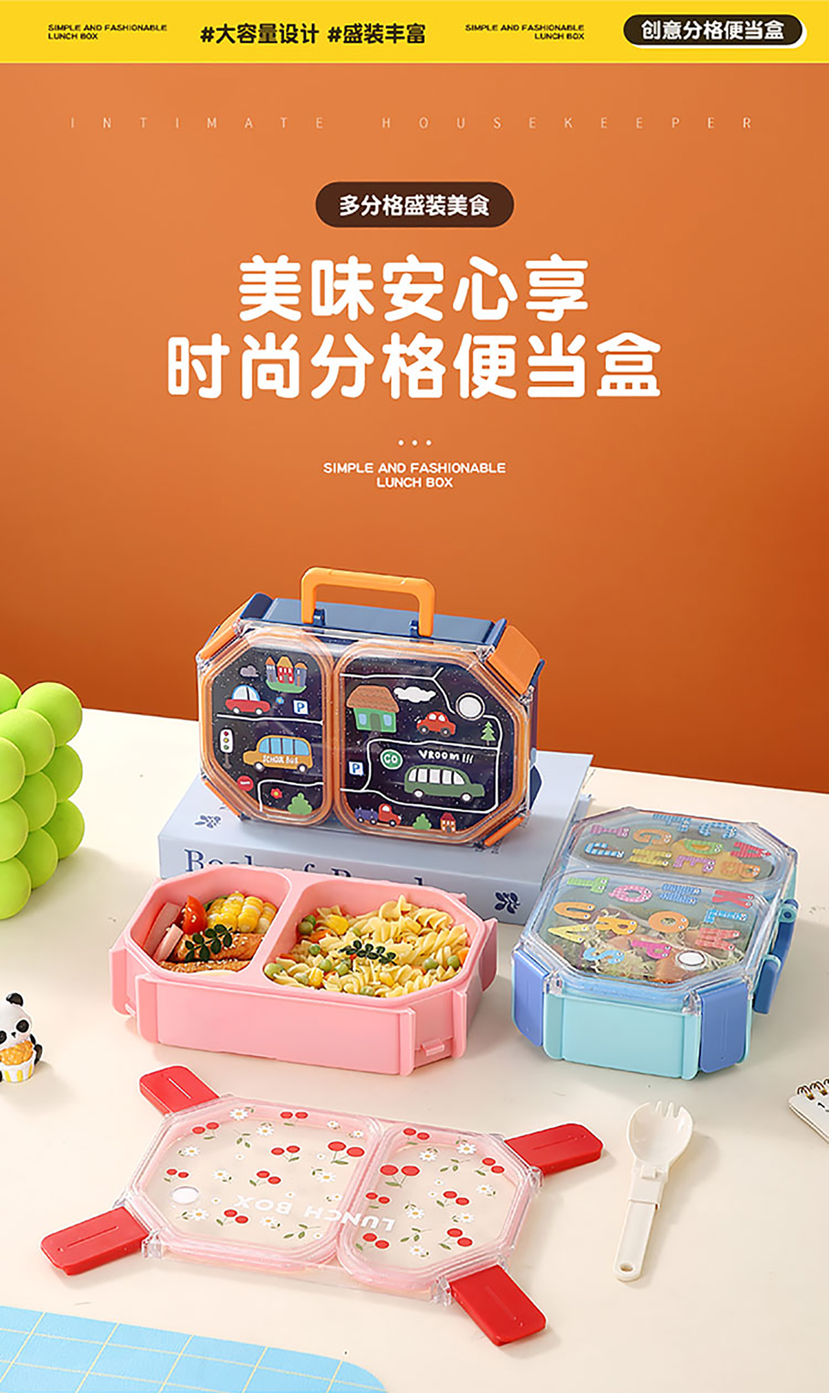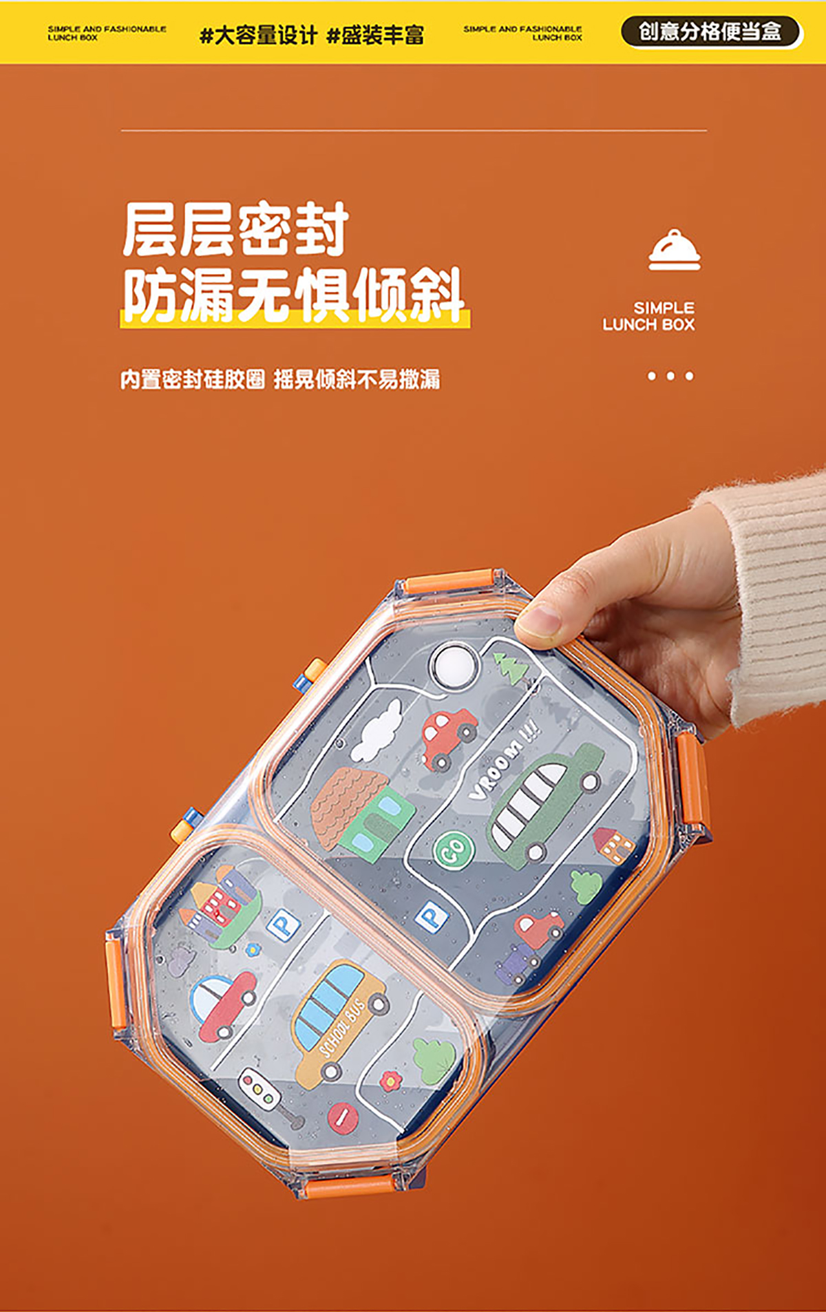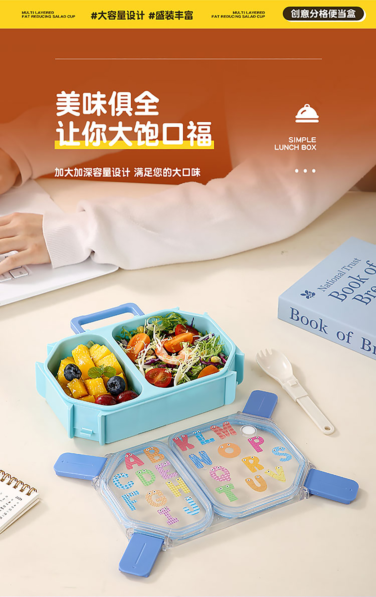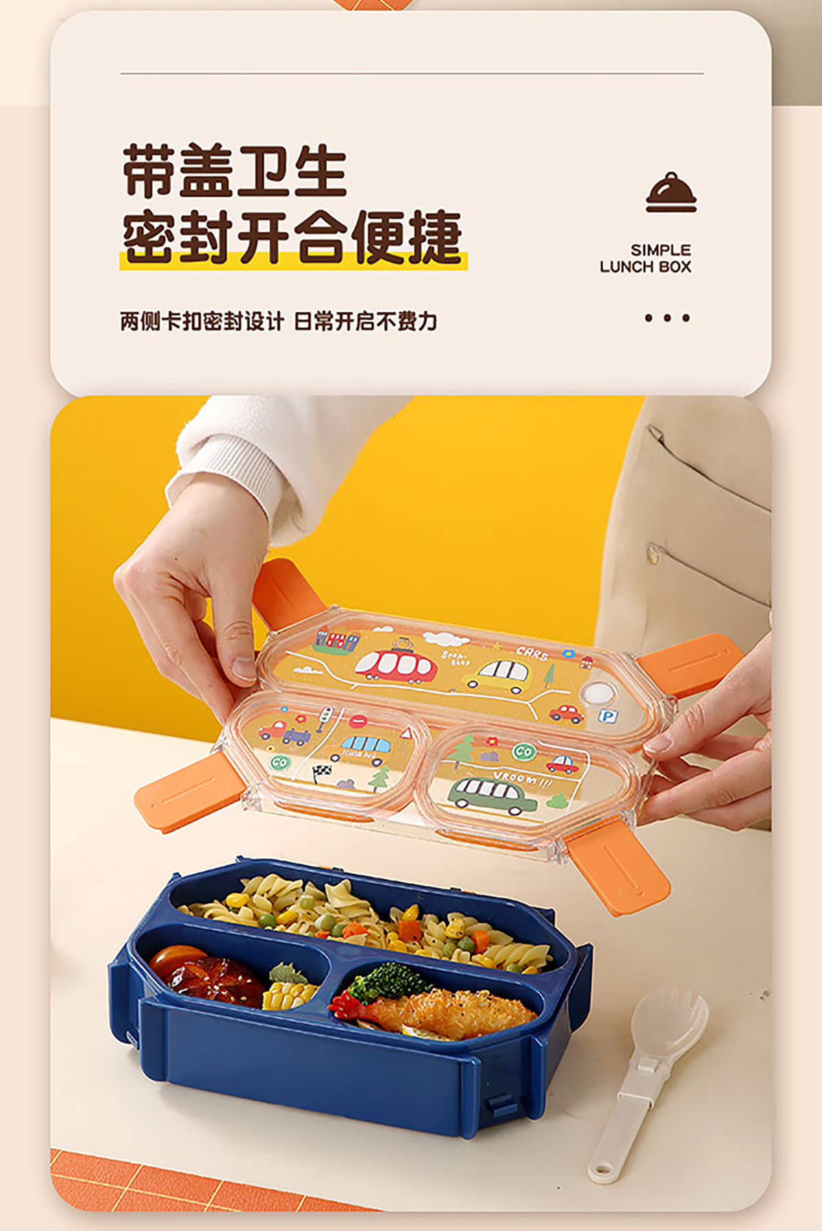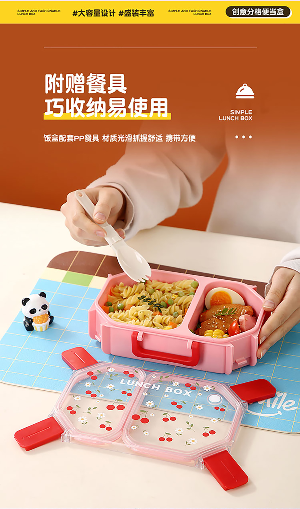 UV手提獨(dú)立密封長(zhǎng)方形塑料兩格980ml/三格900ml餐盒 (配PP折疊叉勺)